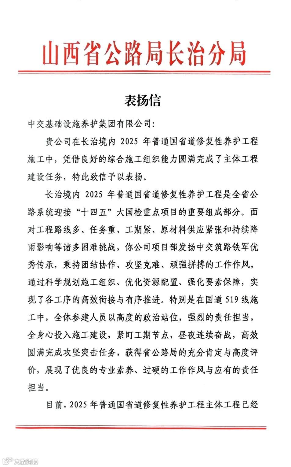 表扬信中还提到,长治境内养护主体工程的顺利完成,既体现了中交养护集团“不畏艰难、敢打硬仗”的拼搏精神,也展示了企业在关键任务面前统筹协调、高效执行、能打硬仗的攻坚能力,树立了行业良好典范。