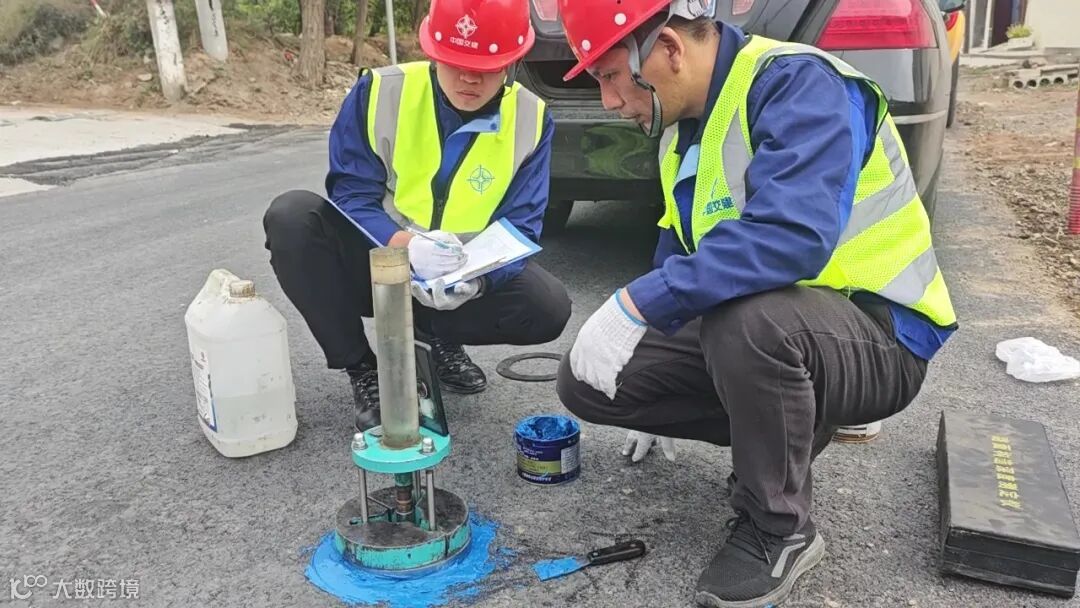 除了对拌和站的检测,廖松洋还对各个路段的施工工作面进行现场巡查。每日在现场完成对水泥稳定基层的压实度、水泥剂量以及厚度的检测,对沥青路面施工厚度、渗水系数、构造深度的随机检测,抽查粘层油/碎石封层的撒布是否符合规范要求。他还巡查施工现场,检查施工工艺的规范性,并检测沥青混合料的摊铺温度是否达到标准。