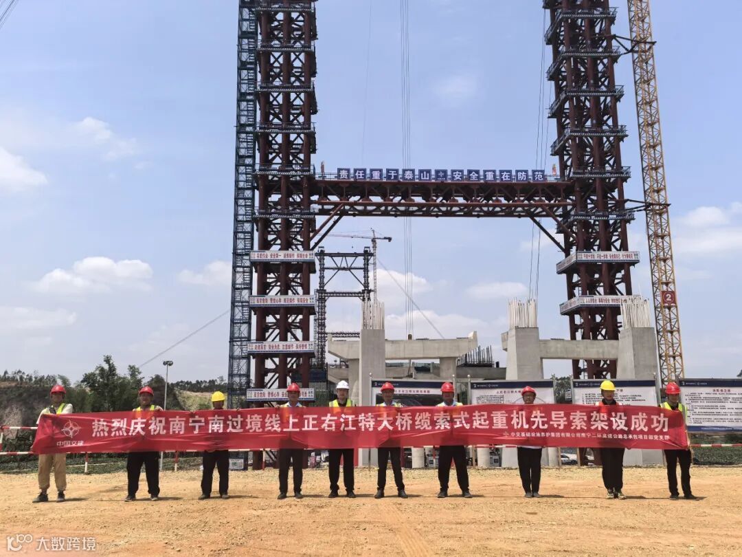 4月25日上午8时至12时,南宁南过境线上正右江特大桥通过工程船牵引完成先导索跨越右江,实现两岸主塔“空中牵手”。