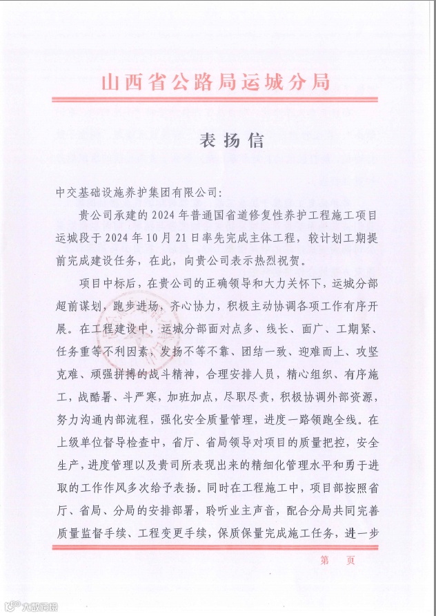 表扬信提到,自8月份开工以来,在各级领导的高度重视及项目管理团队的艰苦努力下,运城分部攻坚克难、主动作为、脚踏实地、砥砺深耕,积极协调解决各项难题,高效有序地推动项目的进度、质量、安全等工作,在不到两个月的有效工期内保质保量完成了功能性修复112.641公里,结构性修复49.706公里,赢得了省厅、省公路局、运城分局等等单位的广泛认可,用履职尽责诠释央企担当,展现讲信誉、重合同、保履约的担当精神。