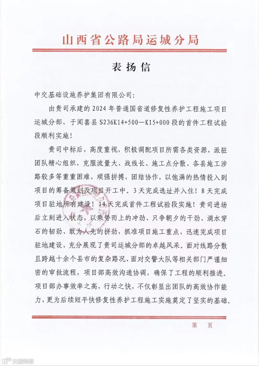 表扬信对公司项目团队乘势而上的冲劲、只争朝夕的干劲、滴水穿石的韧劲、敢为人先的拼劲给予充分肯定,希望项目管理团队继续保持奋发向上、追求卓越的精神风貌,为运城地区道路养护事业做出积极贡献。