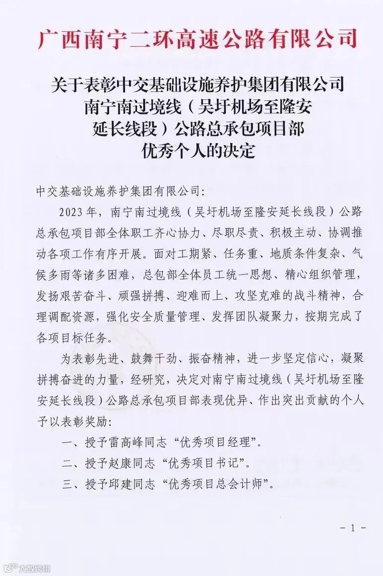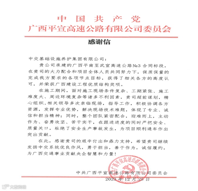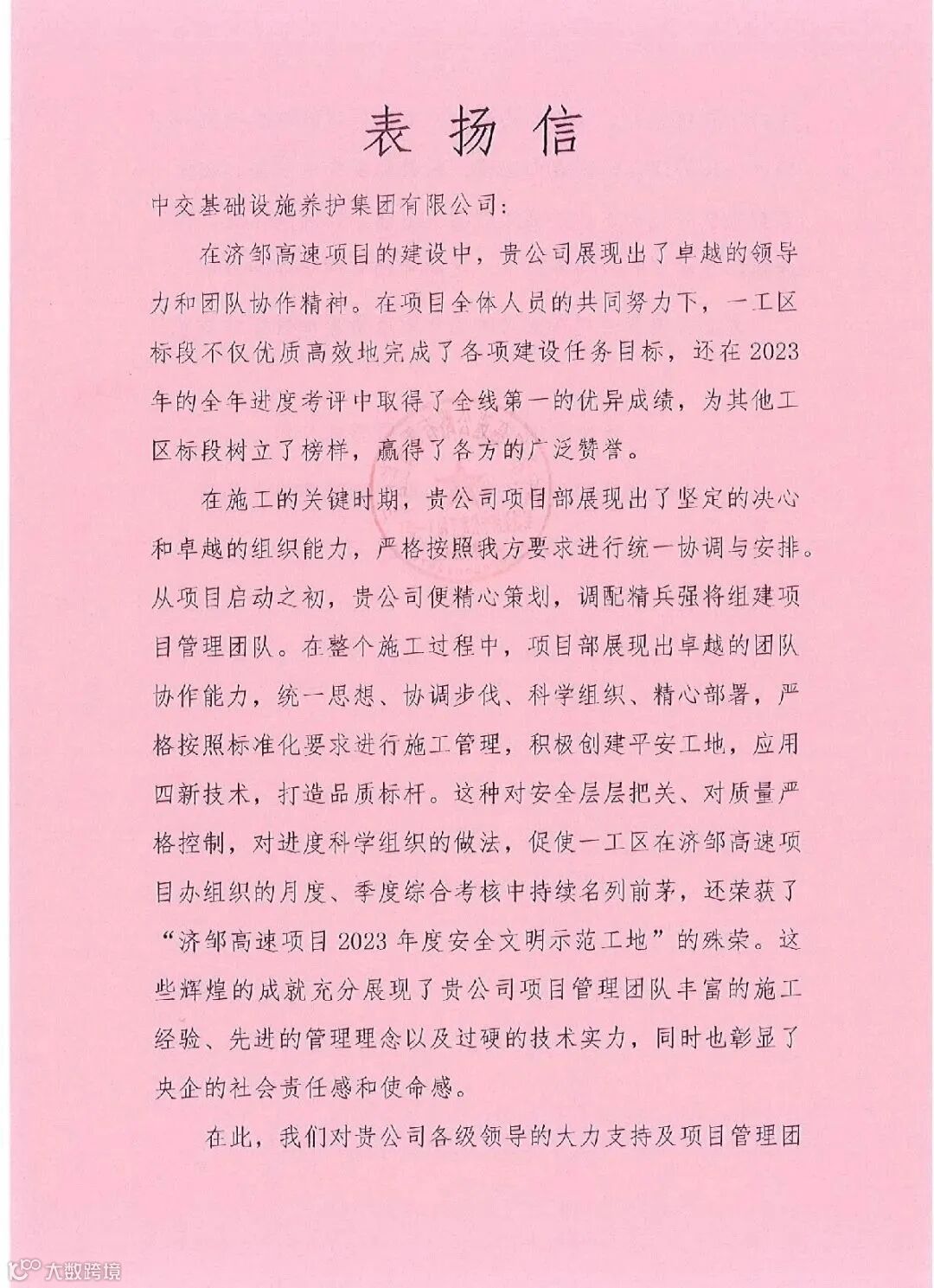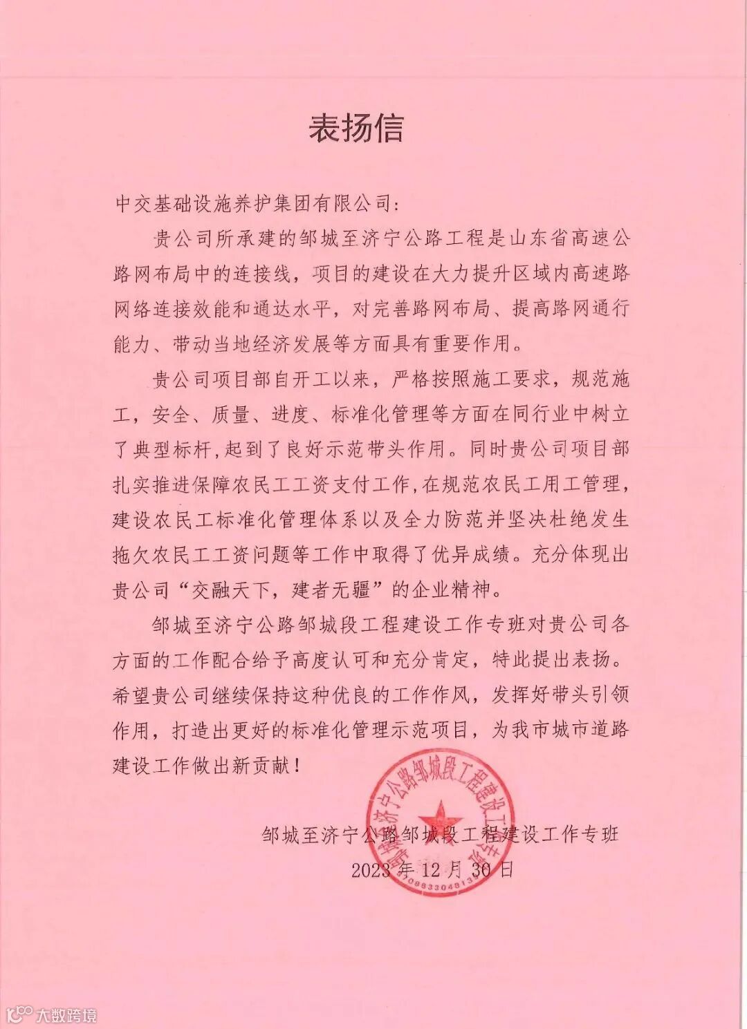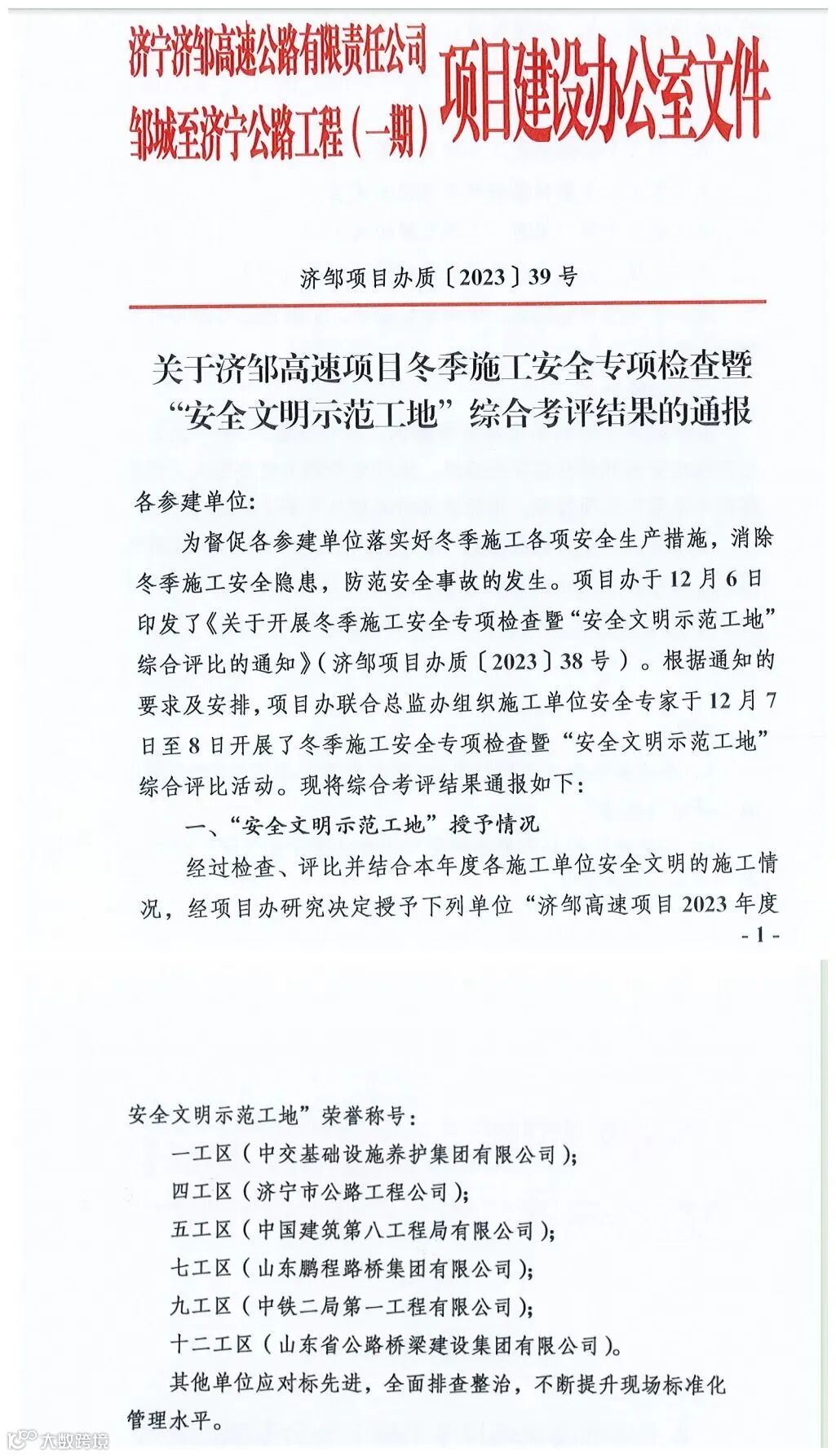 12月12日,山东济邹项目荣获济邹高速项目“2023年度安全文明示范工地”荣誉称号“,并收到济邹高速项目办和邹城市交通局建设专班表扬信”。