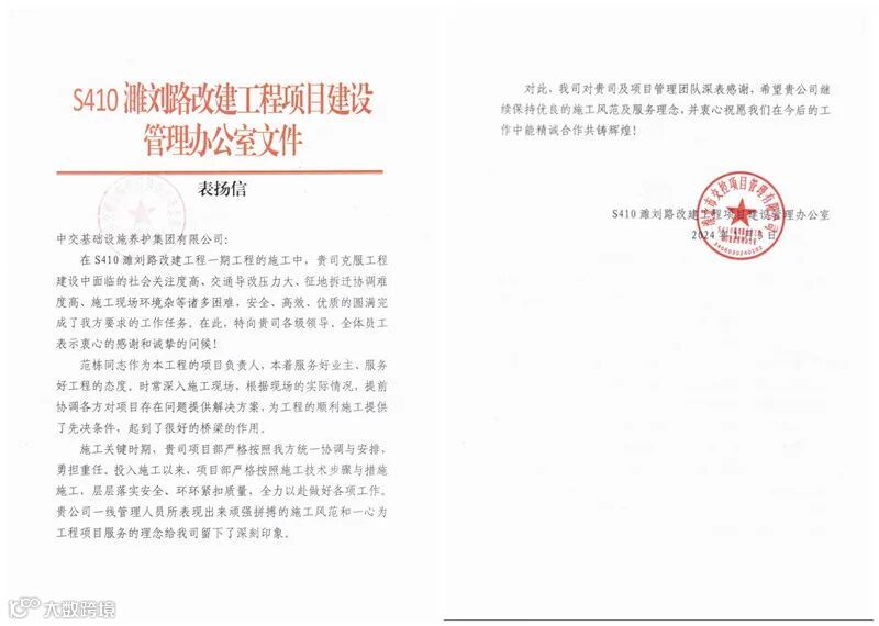 1月3日,S410濉刘项目收到来自业主单位表扬信。信中指出,在面对交通通行压力大、征地拆迁协调难、施工安全风险高等诸多不利因素,通过项目团队迎难而上、精心部署扭转了施工被动局势,保质、保量、保安全的完成2023年各项节点目标。对项目在安全、质量、进度、标准化等方面表示赞扬,对项目管理团队表示高度认可,并向公司以及S410濉刘项目项目全体参建人员表示衷心的感谢!两封表扬信是对项目团队工作的充分肯定,S410濉刘项目将在后续的工作中,始终如一的保持高标准的工作作风,层层落实安全、环环紧扣质量,全力以赴做好各项工作,精益求精,为打造品牌形象贡献更大力量。