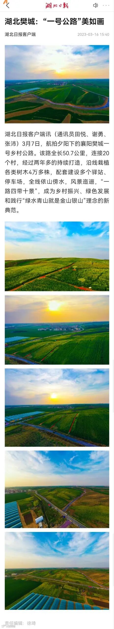 3月19日上午,央视新闻频道《新闻直播间》栏目《春天里的中国》特别节目走进樊城区一号公路,报道了公司承建的樊城一号公路串起村庄新发展。与此同时,湖北日报客户端分别以《湖北樊城:“一号公路”美如画》《樊城:最美乡村路 整装待客来》为题,报道了航拍夕阳下的襄阳樊城一号乡村公路。