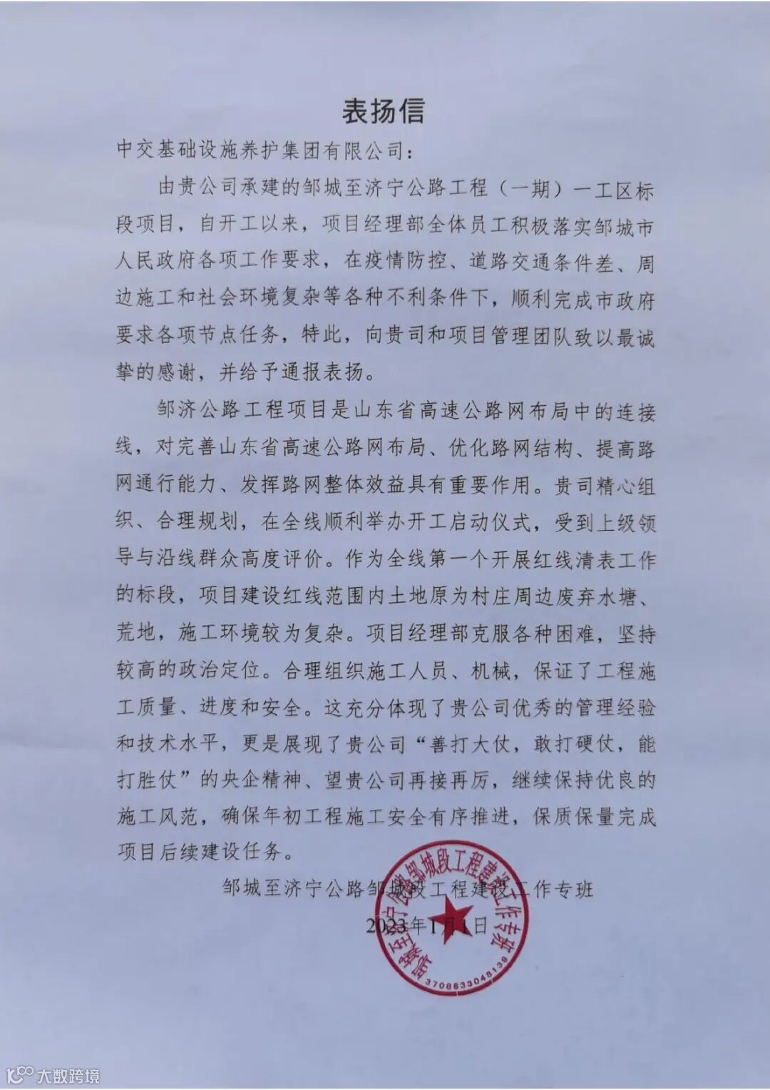 信中指出,在项目开工以来,贵单位积极协调各方、解决重大难题、组织分配各项资源;项目团队发挥“勇拼搏、敢担当、守诚信、善创新”的企业精神,实现项目年度节点目标,为项目的按期完工打下了坚实基础。