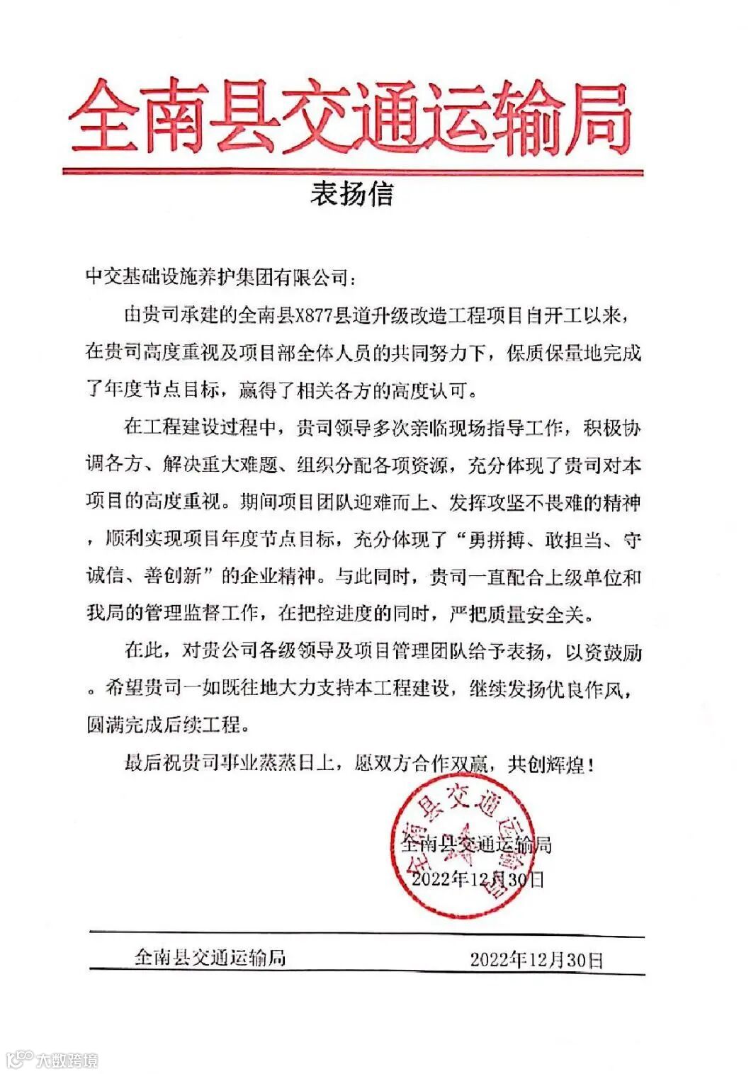 12月30日,全南县道升级改造项目收到全南县交通运输局发来的表扬信。表扬信对公司承建的全南县X877县道升级改造工程项目团队迎难而上、发挥攻坚不畏难的精神,严把进度、质量、安全关,顺利实现项目年度节点目标给予充分肯定。