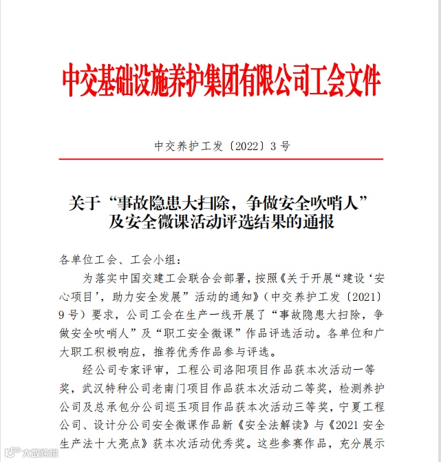近日,中交养护集团工会发文对“事故隐患大扫除,争做安全吹哨人”进行了表彰。公司洛阳项目作品获本次活动一等奖。