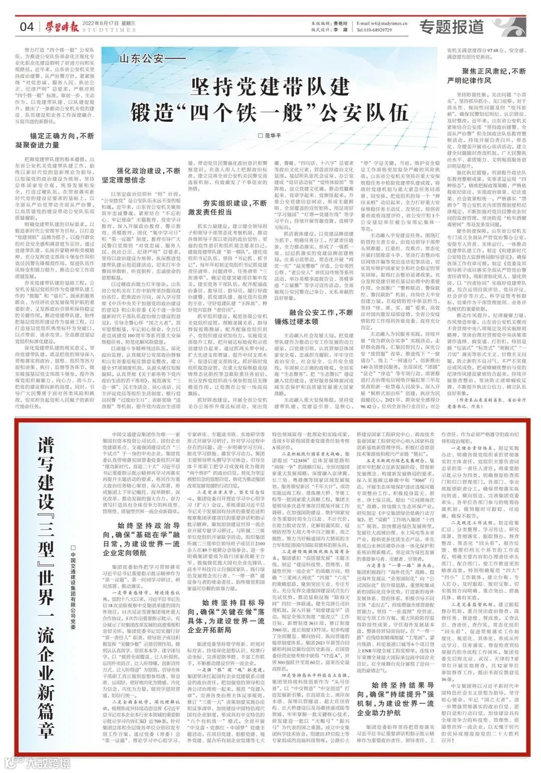 中国交通建设集团作为唯一一家集国有资本投资公司试点、国有企业党建联系点、交通强国建设试点“三个试点”于一身的中央企业,集团党委认真贯彻落实国资委党委组织开展“建功新时代,喜迎二十大”习近平总书记重要指示批示精神再学习再落实再提升主题活动的要求,将其作为重大政治任务精心策划、深入部署,形成集团上下牢记嘱托、高举旗帜、深化改革、推动发展的强大合力,奋力谱写打造具有全球竞争力的科技型、管理型、质量型世界一流企业新篇章。