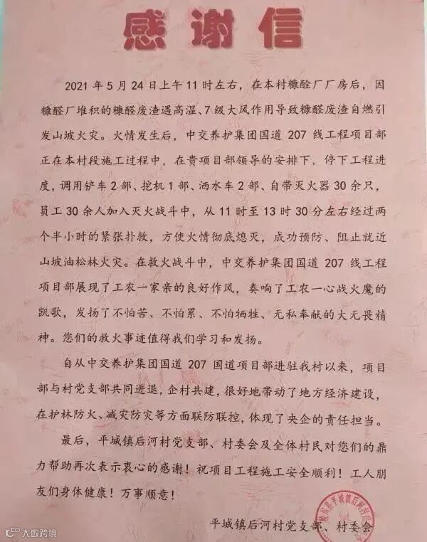 5月25日,晋城市陵川县平城镇政府段韶飞镇长和后河村党支部、村委会向国道207线工程项目部送来锦旗、感谢信和慰问品,对项目部在火灾扑救工作中的突出表现表示感谢。