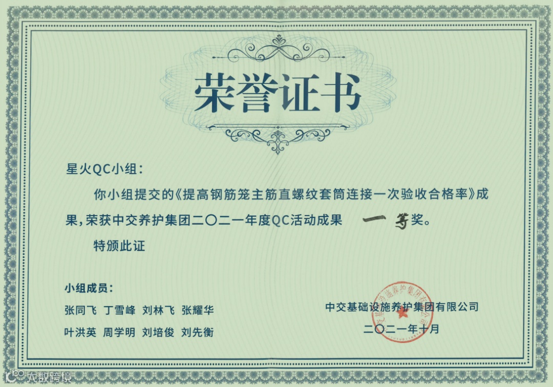 其中,星火QC小组的《提高钢筋笼主筋直螺纹套筒连接一次验收合格率》荣获一等奖、《提高桥梁桩基与墩柱钢筋笼对中一次验收合格率》荣获二等奖;穿山甲QC小组的《提高膨胀土路堑边坡螺旋桩施工一次合格率》荣获二等奖,《提高膨胀土路堑边坡螺旋桩施工一次合格率》荣获三等奖。