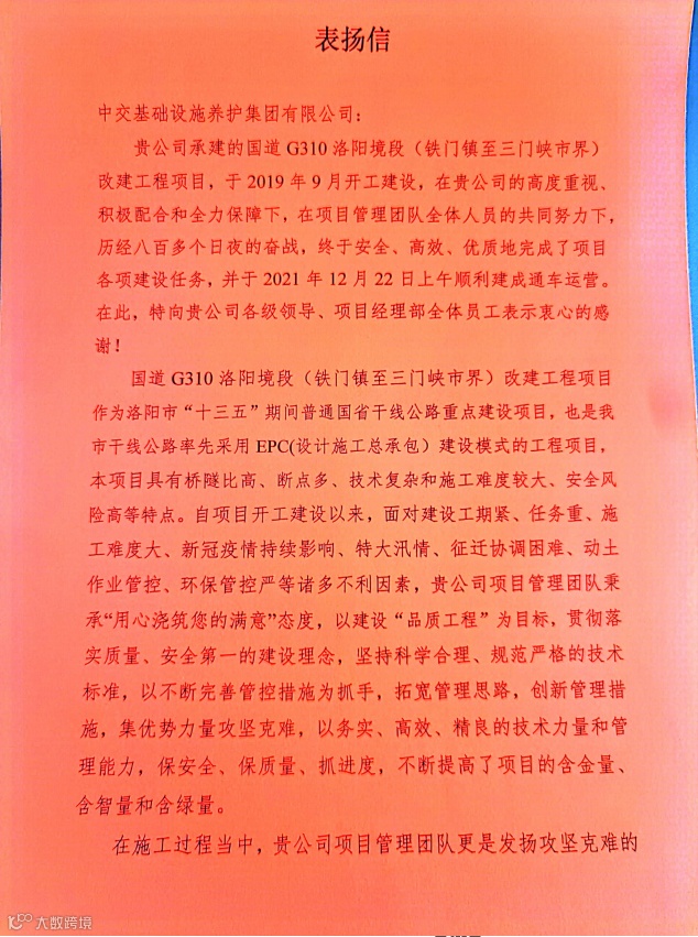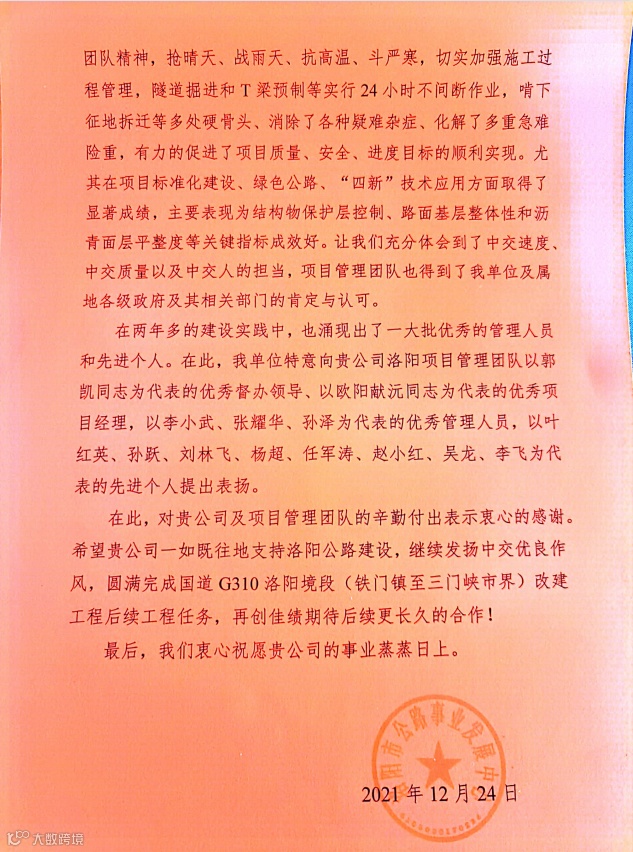 近日,洛阳市道路发展中心发来表扬信,对洛阳项目攻坚克难的精神表示了肯定,对项目全体参建人员表示衷心的感谢和祝贺。