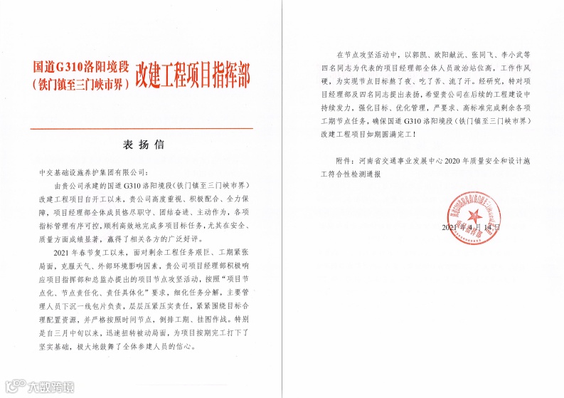 4月14日,公司收到来自国道G310洛阳境段(铁门镇至三门峡市界)改建工程项目指挥部发来的表扬信,表扬信对公司承建的国道G310洛阳项目团队恪尽职守,主动作为,各项指标管理有序可控,安全、质量、高效完成多项目标任务给予充分肯定。