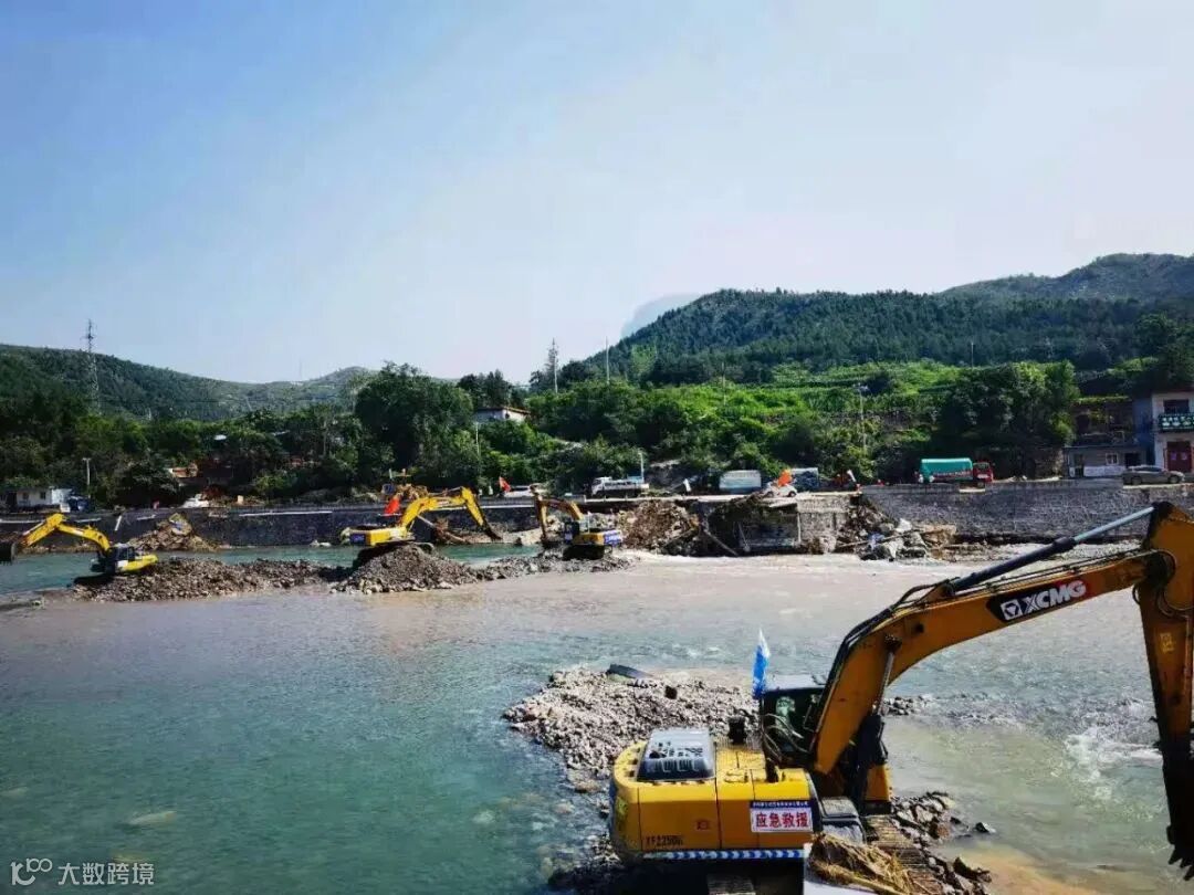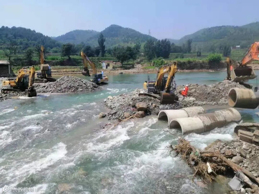 公司救援队在河道就地取材,6台挖掘机和1台装载机火力全开。