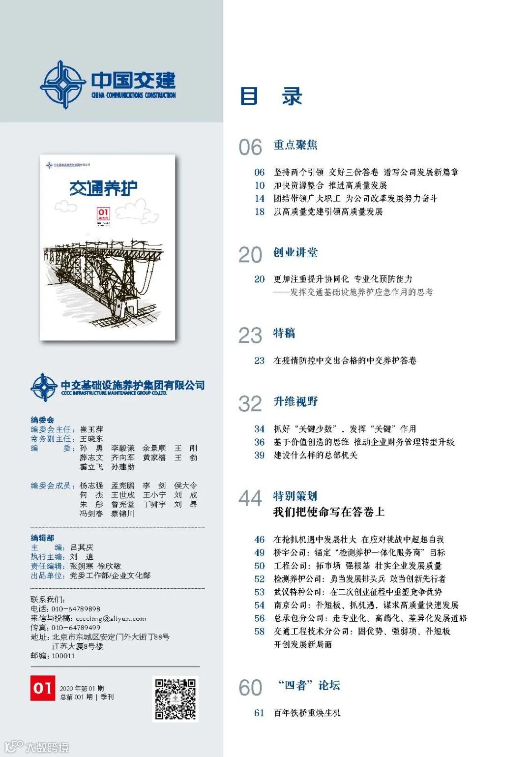 值全面建成小康社会和“十三五”规划收官之年,也是为“十四五”发展奠定基础的关键之年,是中交养护集团由初步成长期发展到巩固发展期,进入高质量发展关键时期,在中交集团与中交养护集团领导的关怀与全体员工的期许中,《交通养护》作为中交养护首本企业刊物,于2020年7月炙热创刊,正式出版,适逢其时。