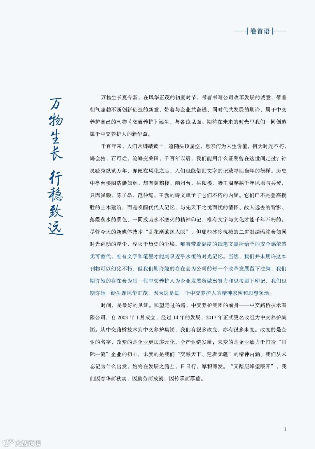 “万物并作,吾以观复”。创刊《交通养护》,是中交养护人记录企业发展的方式;阅读《交通养护》,愿成为你温故知新的习惯。