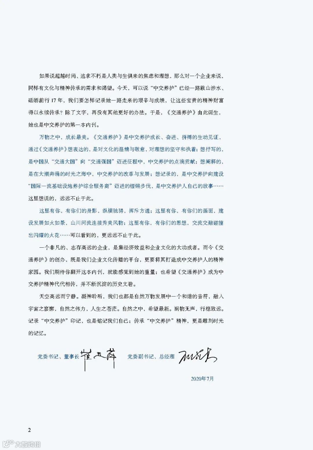 “万物生长夏令新,在风华正茂的初夏时节,带着书写中交养护集团改革发展的诚意,带着朝气蓬勃不断创新创造的新意,带着与企业共奋进、同时代共发展的期许,属于中交养护自己的刊物《交通养护》诞生,与各位见面。”《交通养护》创刊号扉页,中交养护集团党委书记、董事长崔玉萍,党委副书记、总经理王晓东这样寄语。
