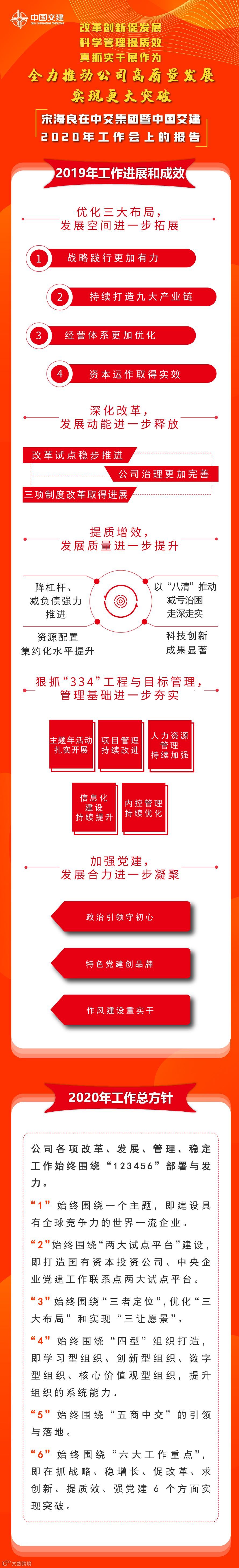 导读:一图读懂中交集团总经理、党委副书记,中国交建总裁、党委副书记宋海良所作题为《改革创新促发展 科学管理提质效 真抓实干展作为 全力推动公司高质量发展实现更大突破》的工作报告。