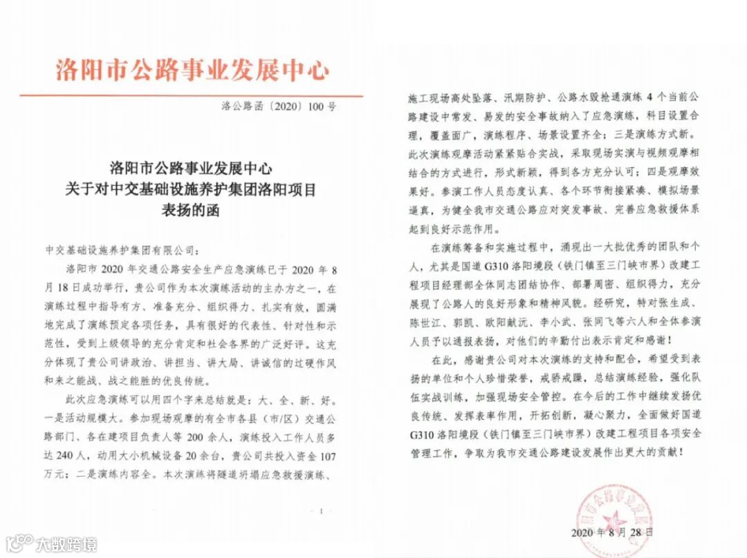 2020年8月18日,洛阳市2020年交通公路安全生产应急演练在国道G310洛阳项目成功举办。近日,洛阳市公路事业发展中心发来表扬信,中交养护集团国道G310洛阳项目作为本次应急演练的承办方,因准备充分、组织得力、扎实有效,圆满完成了演练预定的各项目任务,得到了业主单位各级领导的充分肯定。