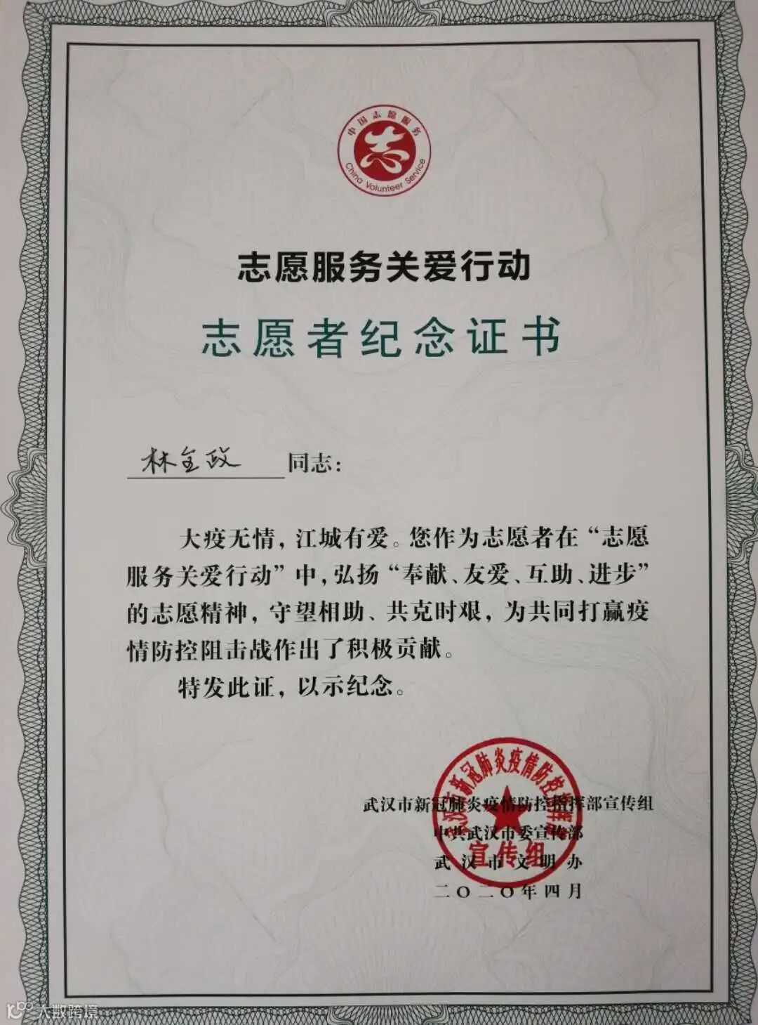 除了感谢信,林全政还收到了武汉市新冠肺炎疫情防控指挥部宣传组、中共武汉市委宣传部、武汉市文明办发来的“志愿服务关爱行动”志愿者纪念证书,对他在“志愿服务关爱行动”中,弘扬“奉献、友爱、互助、进步”的志愿精神给予充分肯定。