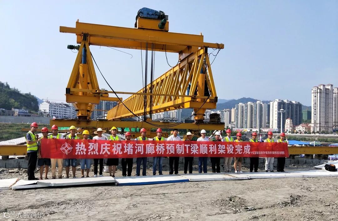2019年8月19日上午9时30分,随着重达133吨的最后一片预应力T梁缓缓落在堵河廊桥桥墩上,堵河廊桥顺利贯通。标志着竹山项目堵河廊桥全面进入桥面系施工阶段,为年底通车打下了更坚实的基础。