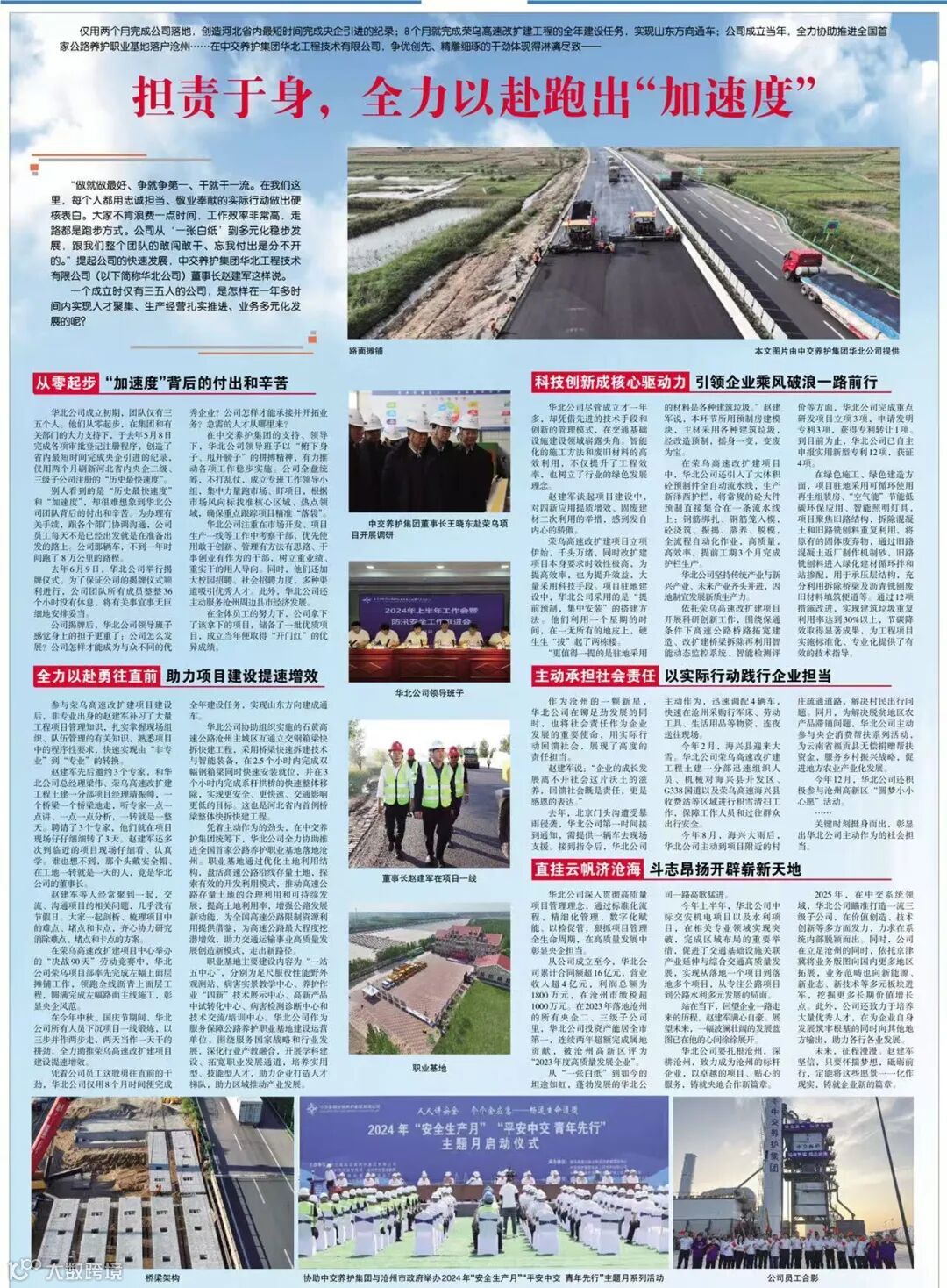 2024年12月31日,《沧州日报》刊发题为《担责于身!中交养护集团华北公司全力以赴跑出“加速度”》文章,概述了董事长赵建军以敢闯敢干、忘我付出的精神风貌,带领公司勇毅前行、快速发展,展现了公司从零起步到多元化稳步发展的显著成就,打造了央地合作新典范。一起来看!