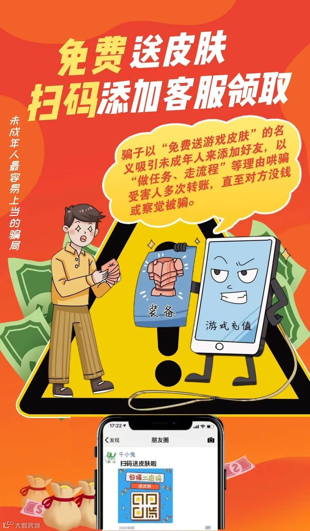 春假时间较长,许多人会上网玩游戏打发时间,这让骗子们钻了空子。以收购玩家游戏账号、低价出售游戏皮肤装备为名,诱使玩家登录“钓鱼”网站进行交易,并以账号提现失败、交纳保证金、账号被冻结等各种理由要求玩家反复转账。