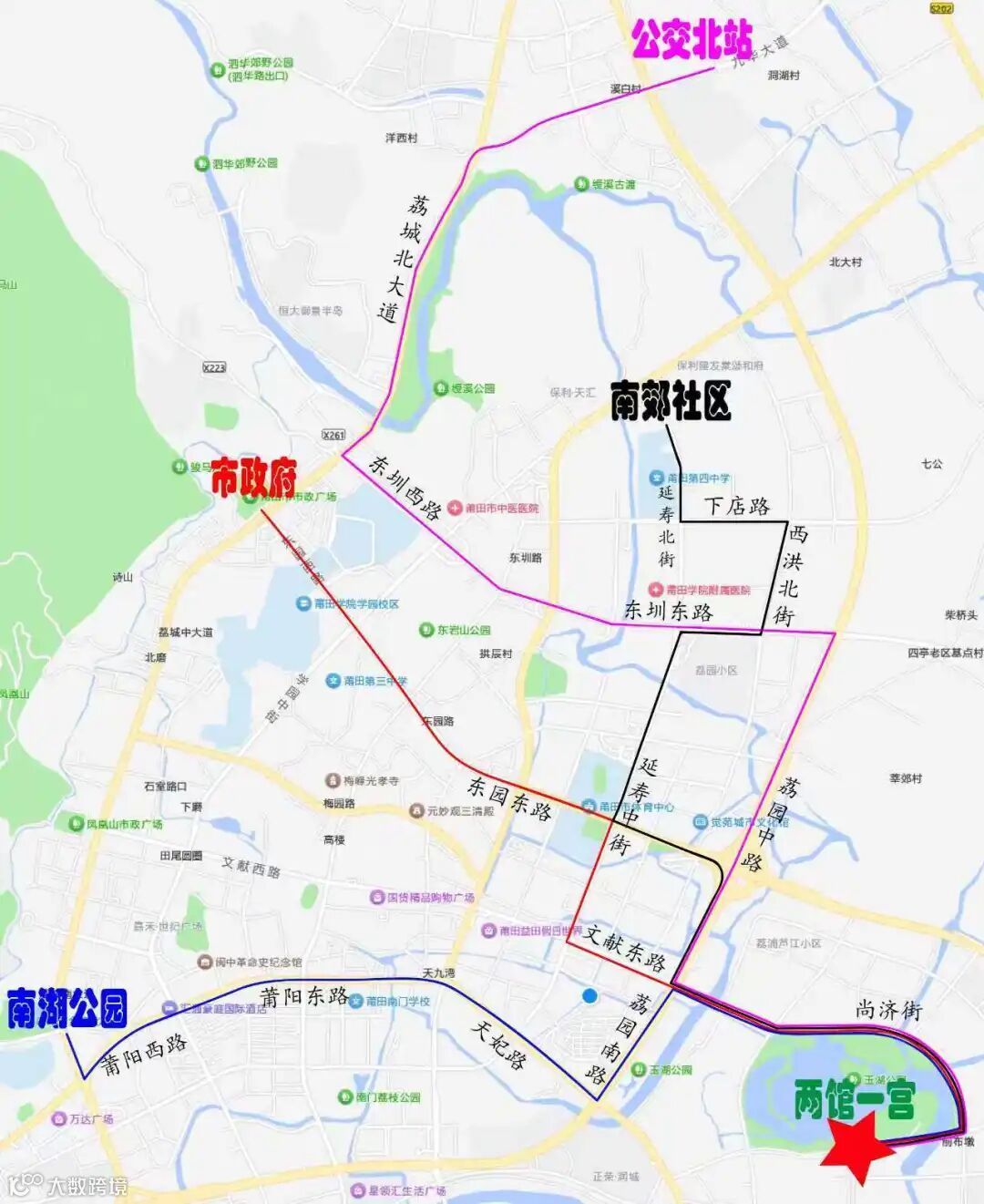 接驳路线:荔城南大道→莆阳路→天妃路→荔园南路→尚济街→玉湖路