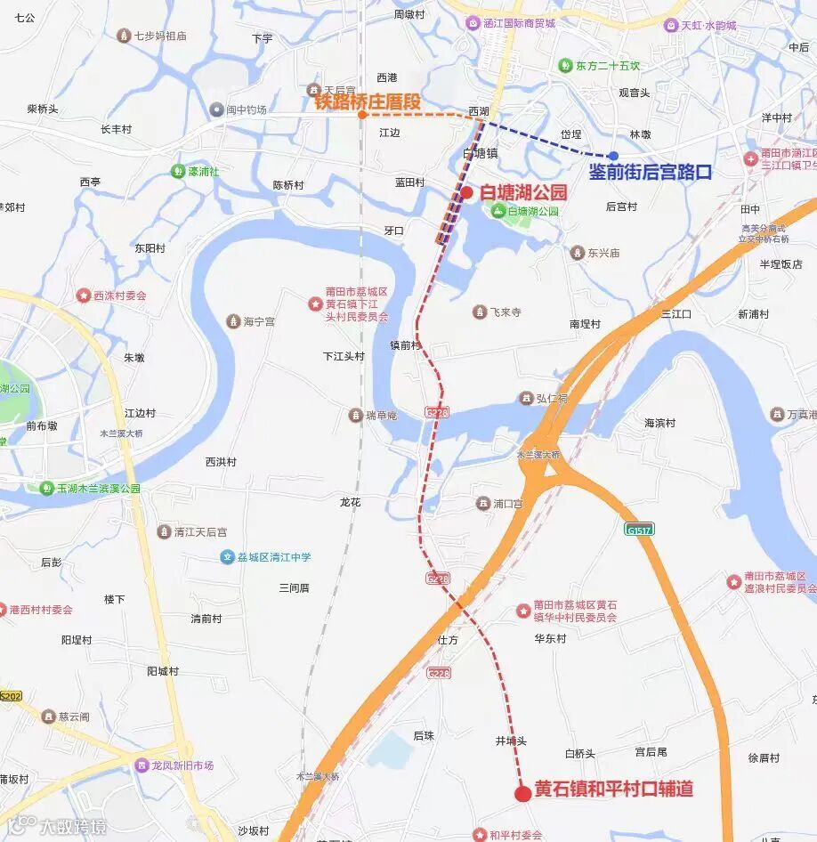 涵江区白塘湖线路走向示意图