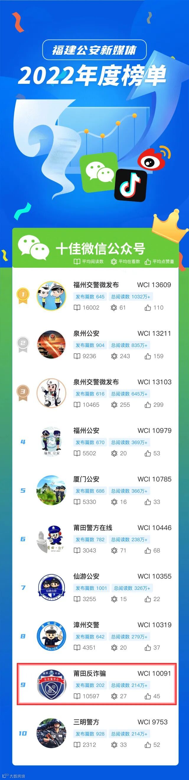 今日,福建省公安厅通报2022年度全省公安机关“十佳”新媒体评选结果,