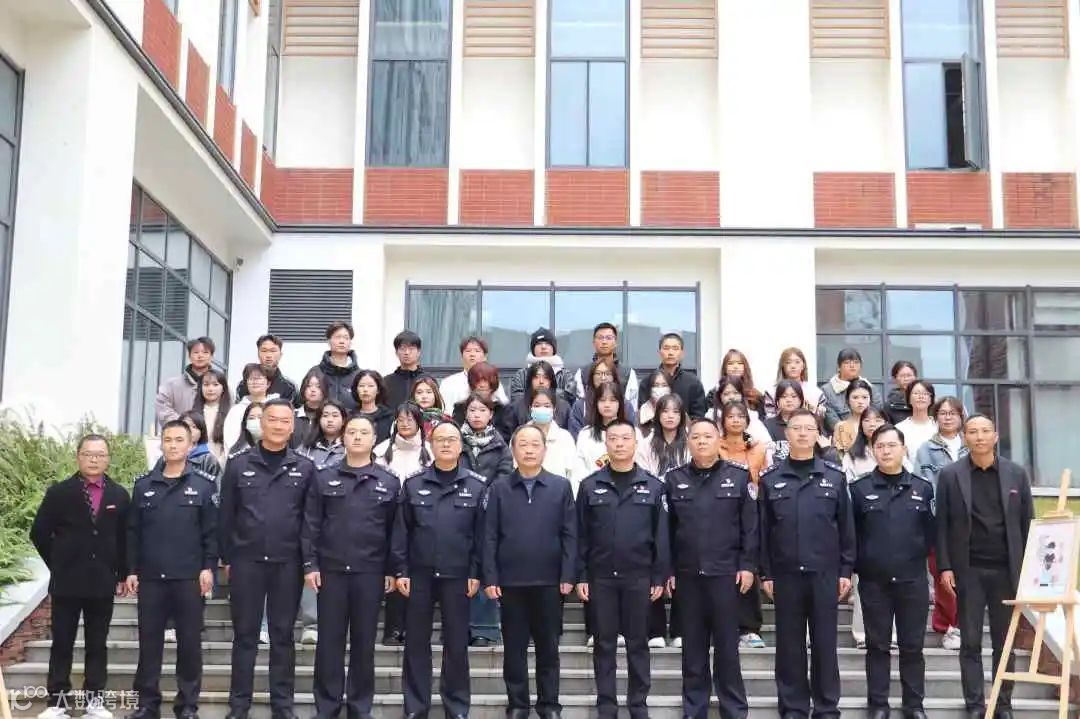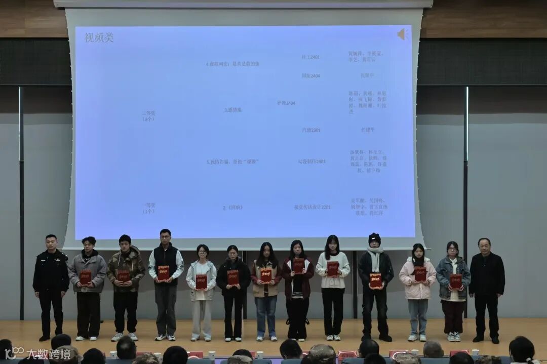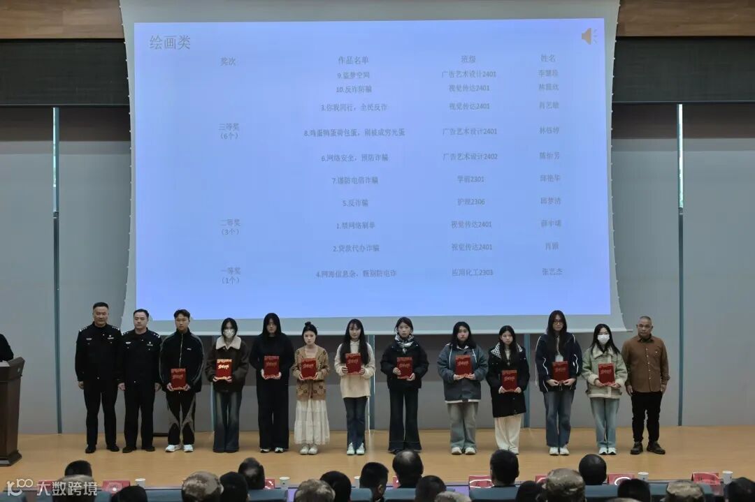 与会领导为获得“警惕诈骗新手法 不做电诈工具人”主题反诈创作大赛一、二、三等奖及优秀奖作品的同学代表颁发奖状并合影留念。