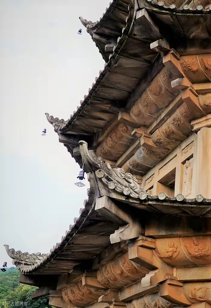 各层塔檐薄而长,轻巧美观。檐下两层迭涩,浮雕的形象有凤凰、双头羽人、飞仙及奇花异草等。(摄影/舒小简)