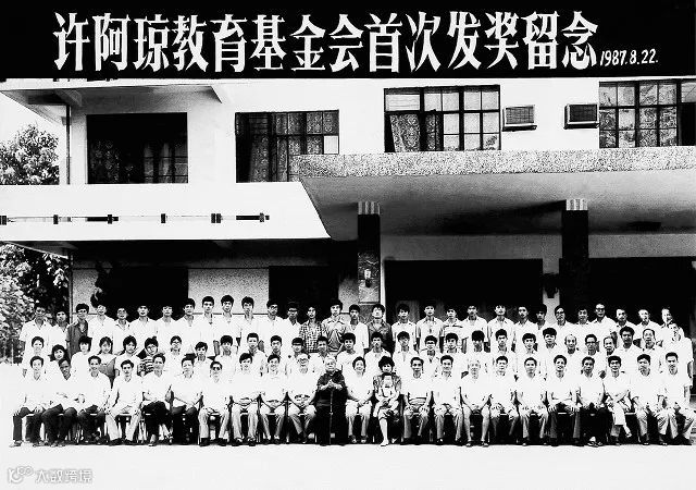 1987年8月22日,许阿琼奖学委员会举办首届颁奖大会。许阿琼女士(前排左起第11位)与参会领导嘉宾,同全市高考成绩前52名获奖学子合影。(供图/许阿琼奖学委员会)