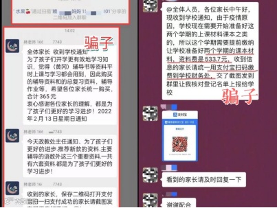 当成功潜入班级QQ群、微信群后,通过克隆老师的头像和昵称,冒充学校老师在群内发布虚假收费信息及收款二维码,诱骗家长通过扫码转账。