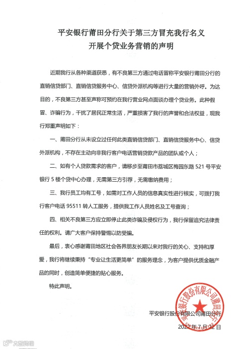 平安银行莆田分行紧急发布声明