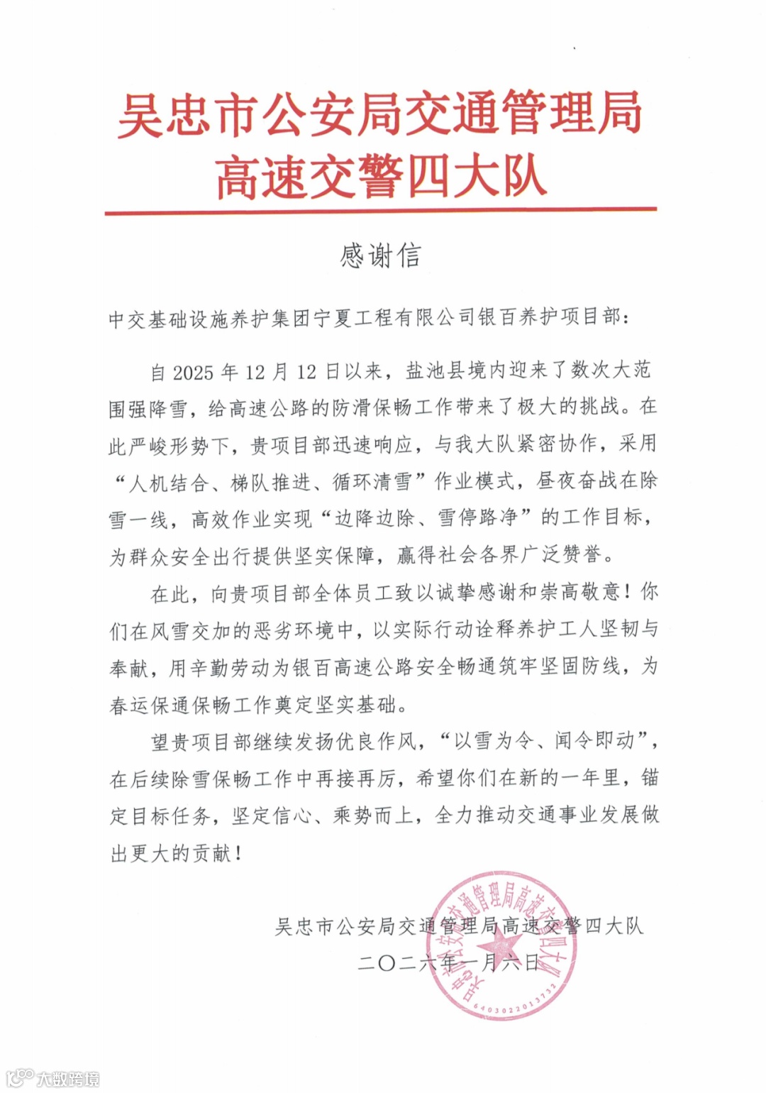 自2025年12月12日盐池县境内遭遇强降雪以来,公司银百高速养护项目部与高速交警四大队紧密协作、快速响应。感谢信中指出,面对极端天气,项目部闻令即动,采取“人机结合、梯队推进、循环清雪”作业模式,高效完成除雪任务,实现“边降边除、雪停路净”,为群众安全出行与社会交通顺畅提供了坚实保障。交警部门特别赞扬公司一线员工在风雪中展现出的坚韧作风与奉献精神,为后续春运保通保畅工作奠定了扎实基础。
