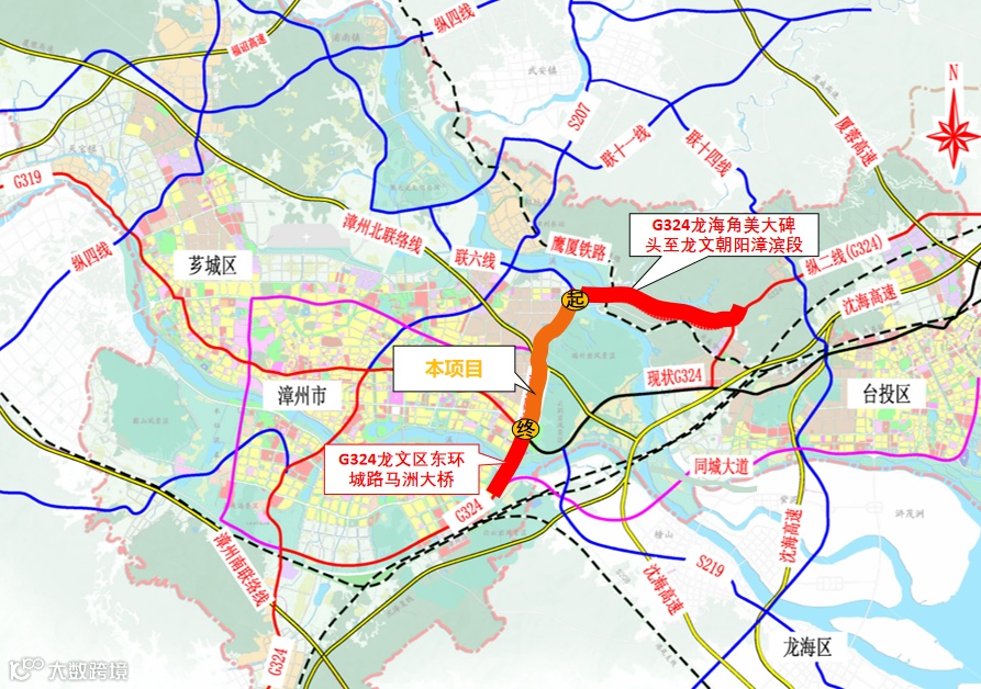 该项目起点位于龙文区朝阳镇漳滨村附近,顺接国道G324线龙海角美大碑头至龙文朝阳漳滨段公路,终点位于跨迎宾大道高架桥处,顺接G324线龙文区东环城路马洲大桥,路段总长4.7公里。项目采用一级公路兼城市道路功能的标准建设,设计速度80公里每小时,双向八车道,路基宽60米,项目总投资约12亿元。