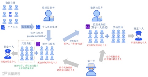 目前«个保法»对匿名化与去标识化的定义中未有对“无法识别到特定个人”的“识别主体”作出相应规定,但在实际业务场景中,对个人信息的保护考虑可能是“第三人”不可识别出特定个人,而对数据发送和接收方则是利用管理的手段保障个人信息安全.