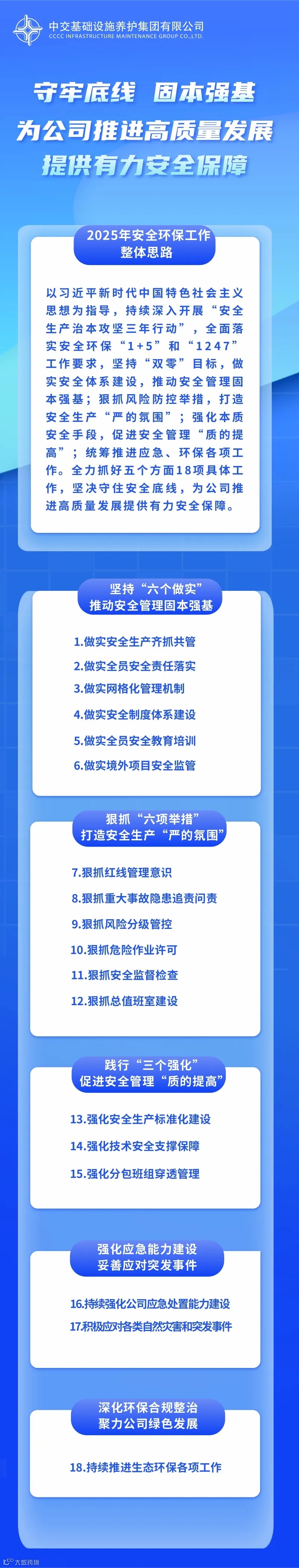 会议传达了中交集团暨中国交建2025年度安全质量环保工作部署会暨安全专项检查总结会议精神。会议全面总结中交养护集团2024年安全生产工作,分析当前形势和面临的主要问题,安排部署2025年重点工作任务。