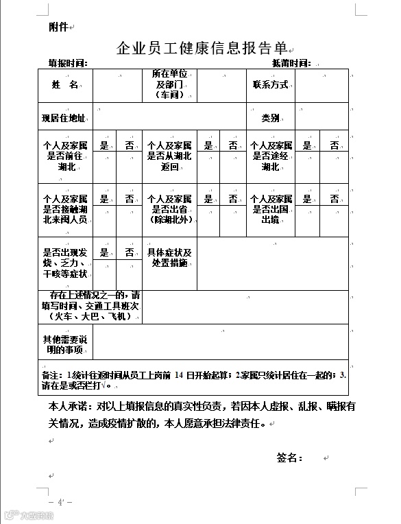 二、落实健康信息申报。企业应建立员工健康档案,对员工上岗前14天以来的健康状况、活动区域、是否接触重点疫区人员等信息进行全面登记收集(表单见附件1),及时掌握员工健康信息。返岗员工应如实申报并作出承诺,若因虚报、乱报、瞒报有关情况,造成疫情扩散的,将依法追究法律责任。