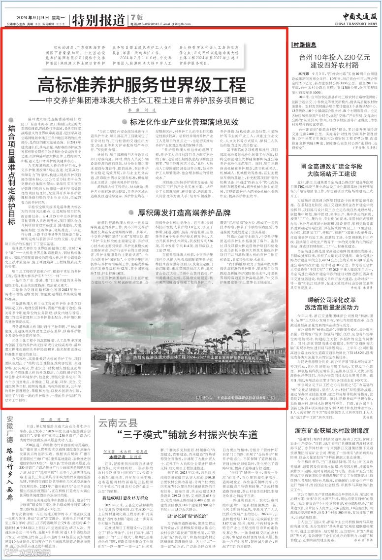 能够胜任港珠澳大桥这一世界级跨海通道的养护工作,离不开中交养护集团长期在专业领域的深耕。多年来,中交养护集团坚持“五者”发展定位,即“养护专业标准的主要制定者、养护核心技术的主要引领者、养护发展模式的主要探索者、养护行业平台的主要创建者、养护优质服务的主要提供者”。作为公路养护“国家队”,中交养护集团积极参与养护标准编制工作,主编或参编的已发布各级标准42项,其中国家标准7项、行业标准10项。