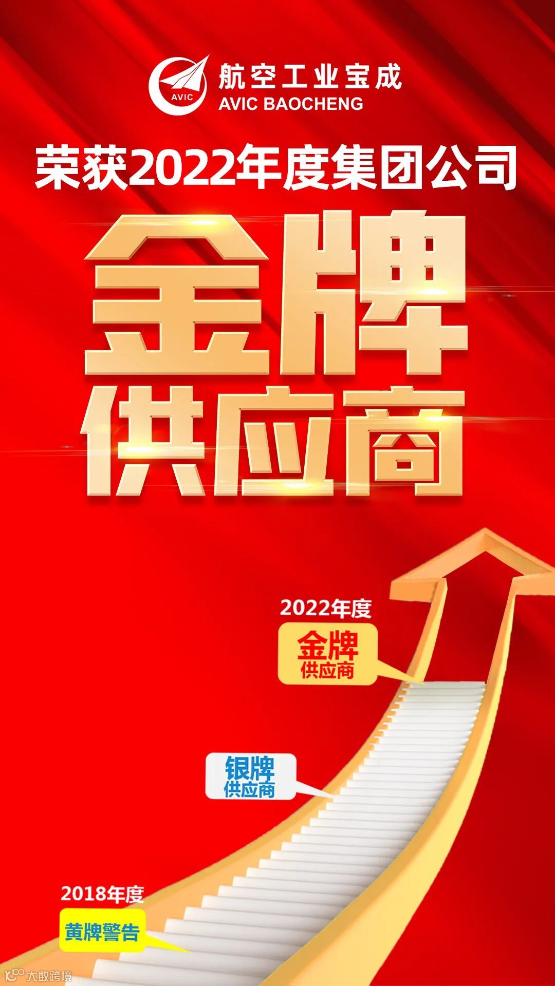 ▍2023年4月4日,航空工业集团召开2023年军品供应商大会,宝成在全集团机载成品供应商评级中排名第8,首次荣获“金牌供应商”称号。