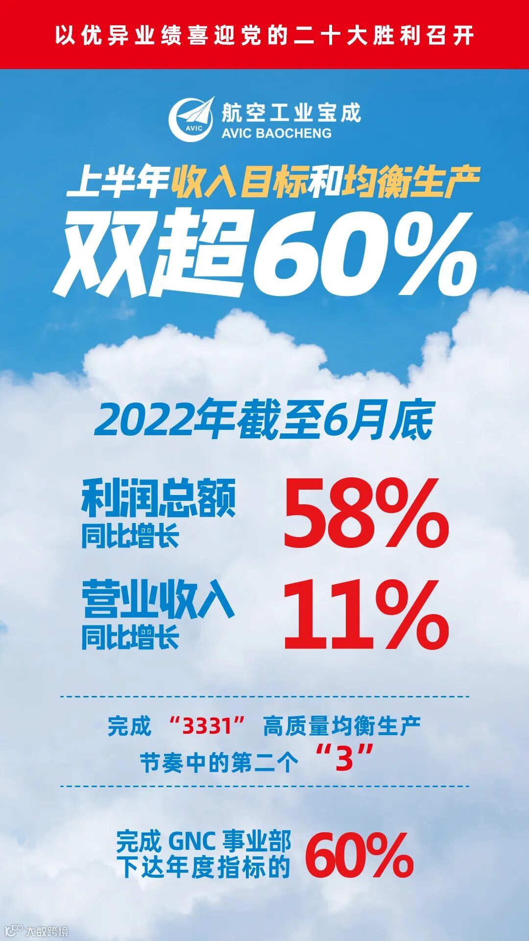 ▍航空工业宝成克服一季度驻地疫情暴发和供应链产业链受阻等因素的多重影响,踔厉奋发、稳中求进,在集团公司、机载系统和GNC事业部的坚强领导下,坚决落实宝成“四早 五更”和“三个一切”生产文化理念,在一季度实现双“3”目标,5月份提前实现收入过半的基础上,生产经营再传捷报:截至6月底,营业收入较上年同比增长11%,完成GNC事业部下达指标的60%,实现超过半;利润和净利润指标较上年同比增长58%。科研生产交付较上年同期实现持续增长,完成 “3331” 高质量均衡生产节奏中的第二个“3”,以优异业绩喜迎党的二十大胜利召开。