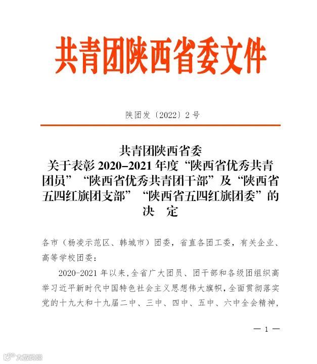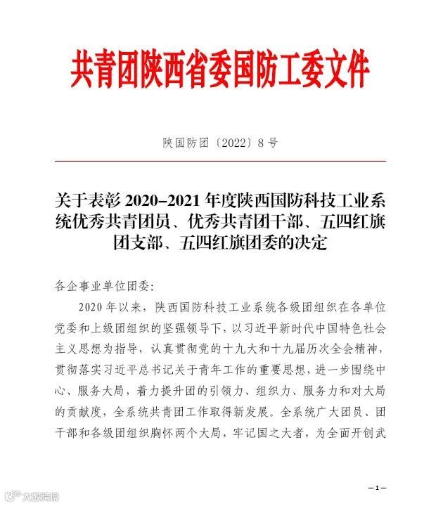 近日,共青团陕西省委和共青团陕西省委国防工委分别印发《关于表彰2020-2021年度陕西省“优秀共青团员”“优秀共青团干部”“五四红旗团支部”及“五四红旗团委”的决定》和《关于表彰2020-2021年度陕西国防科技工业系统优秀共青团员、优秀共青团干部、五四红旗团支部、五四红旗团委的决定》,公司共青团工作荣获上级多项表彰: