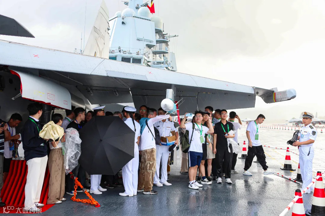 2024年11月13日,中国航展期间,歼15T“珠海”撑伞,为民众遮风蔽雨;2025年7月5日,山东舰开放期间,歼15T再次成为避风港。