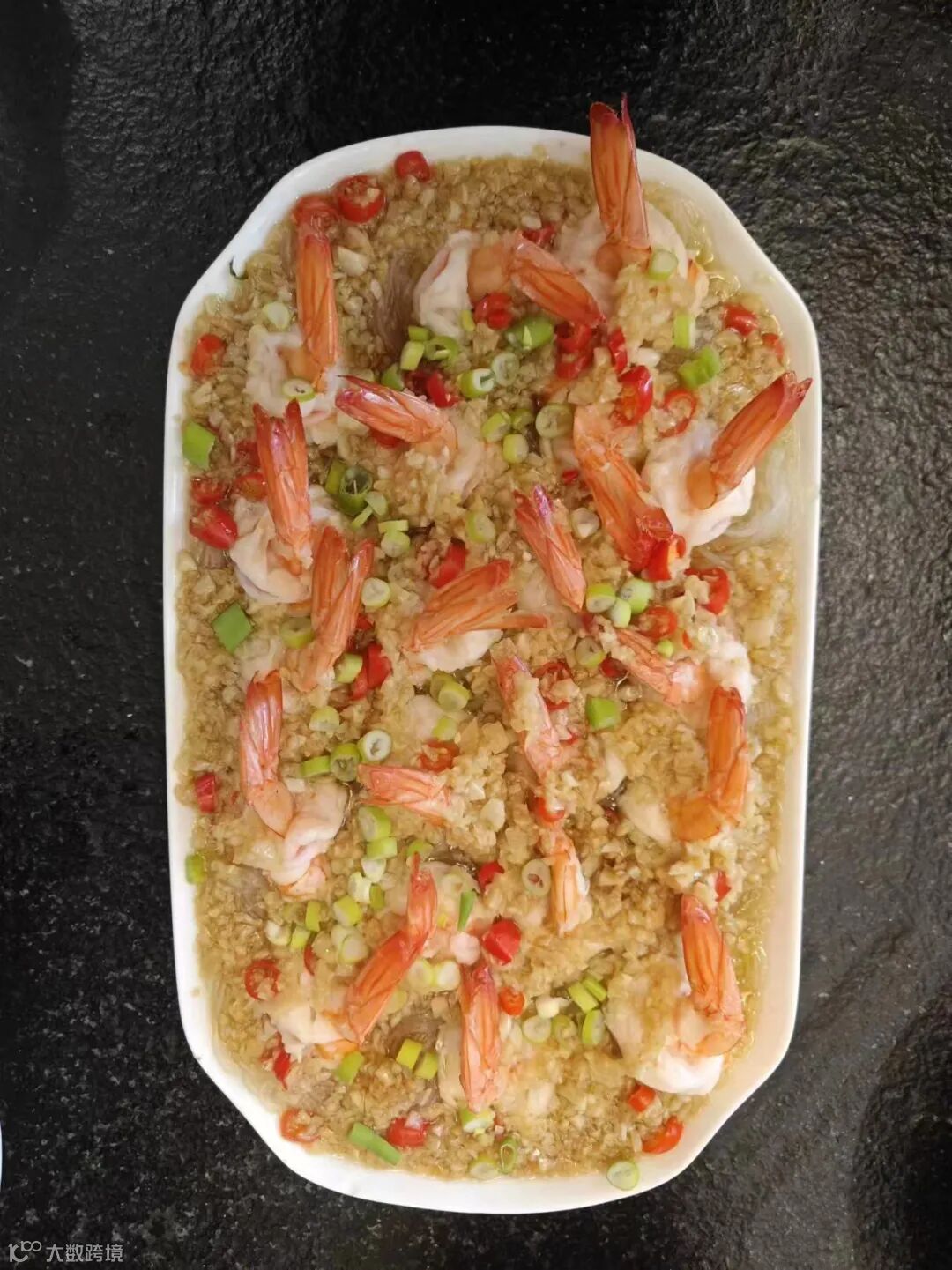 蒜蓉粉丝虾,是海南的传统名菜,以对虾、粉丝等为主料,大蒜、葱和青椒丝为辅料,特点是鲜嫩味美,色泽光艳,营养丰富,老少皆宜,寓意红红火火,好事连连。