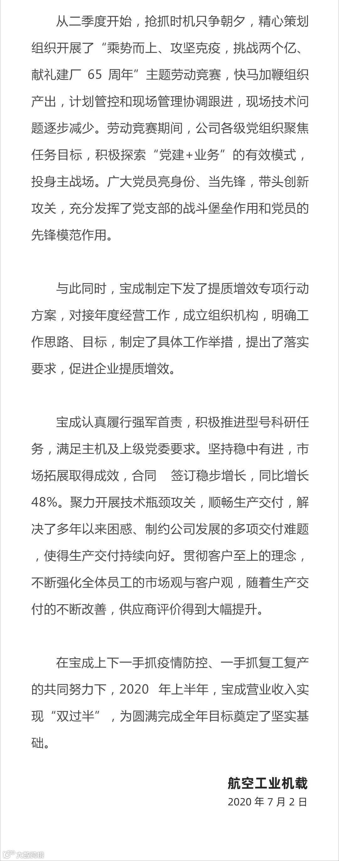 导读:航空工业机载报道宝成公司顺利实现“双过半”