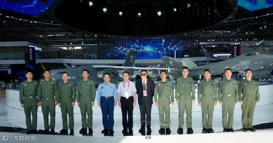 航空工业党组副书记李清堂、航空工业新闻发言人周国强、空军新闻发言人申进科大校与参加第十四届中国航展的运油20、歼20、歼16、轰6 K、空警500A、教10、攻击2、八一飞行表演队、红鹰飞行表演队的9名飞行员在航空工业展台合影