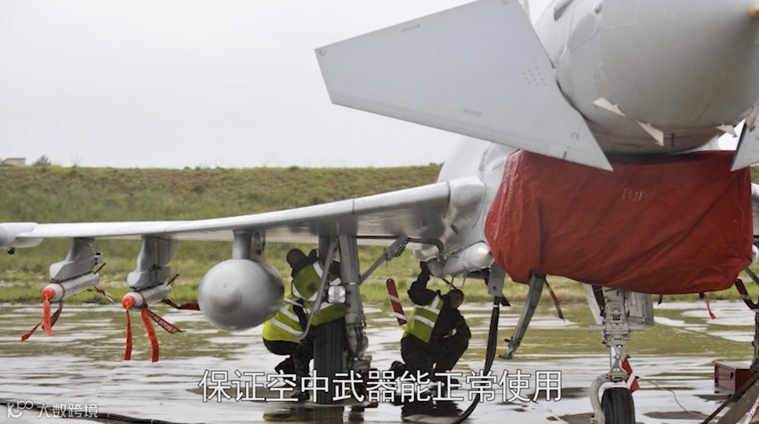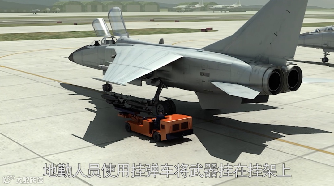 飞机上天前,地勤人员使用挂弹车将武器挂在挂架上,并连上各种线缆。