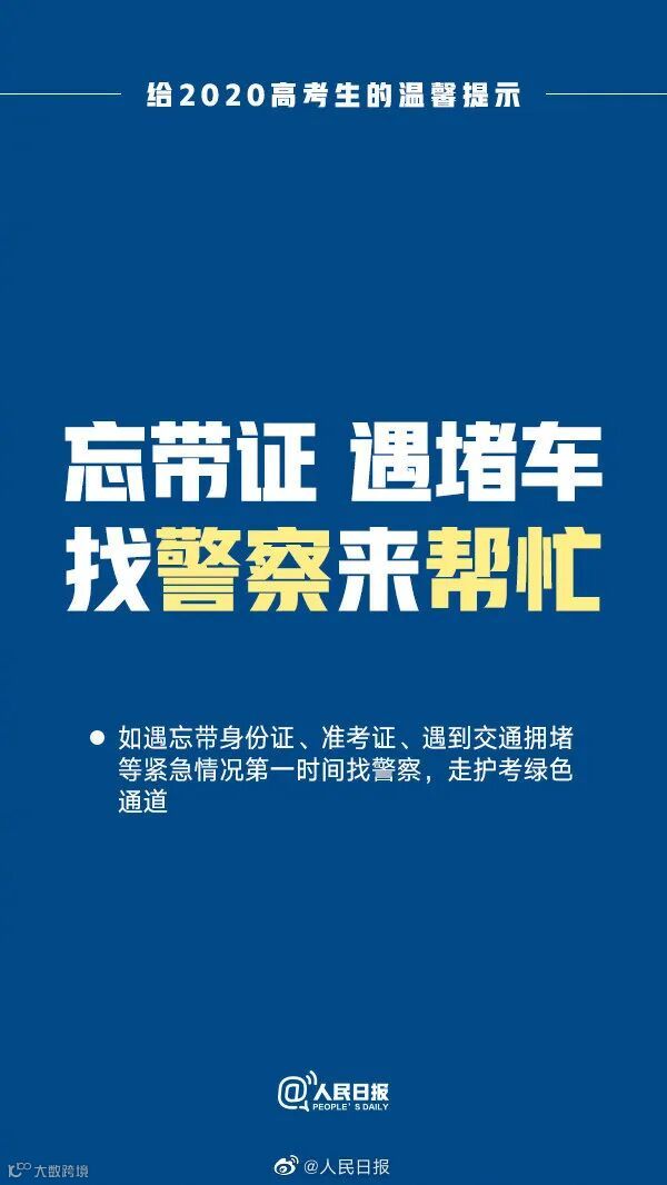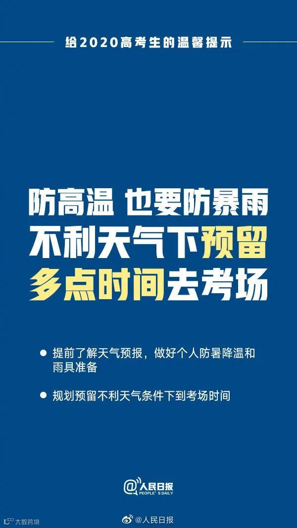 考试用品要带全,身份证准考证别忘掉;建议提前准备口罩;体温37.3℃以下方可进考场;饮食不搞特殊化,吃清淡,不贪凉;7月的高考要了解天气预报,预判高温暴雨等极端天气…