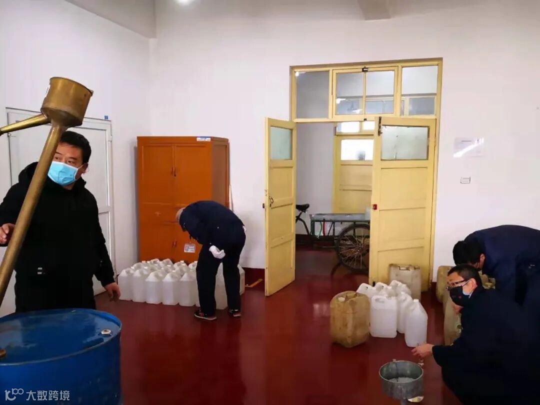 95%的酒精需要配制成75%才能达到消杀病毒的目的,酒精到位后李立新立即组织搬运酒精,灌注蒸馏水,进行浓度配制,先后三次共配制了750KG酒精,并分装到小器具内摆放整齐,以便发放。